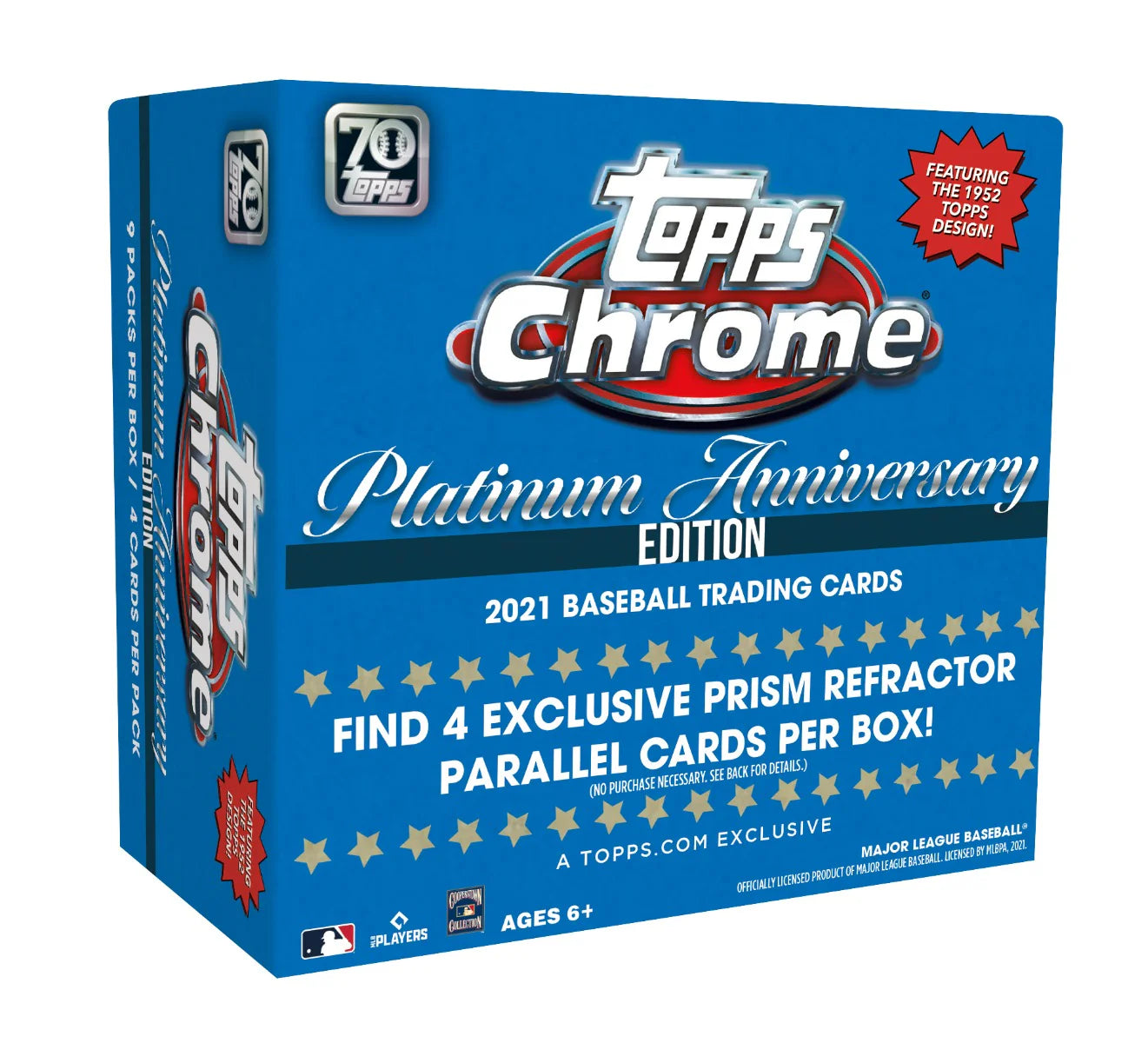 The 2021 Topps Chrome Platinum Anniversary Baseball Hobby Box delivers a grand slam of heritage, shine and high-end collector appeal. With a chromium makeover of the iconic 1952 design, this set offers everything serious collectors crave—veterans, rookies, legends and premium chase cards—all packaged in one thrilling release. As the voice of the game might say, if you don’t get this, you risk being left on the bench.