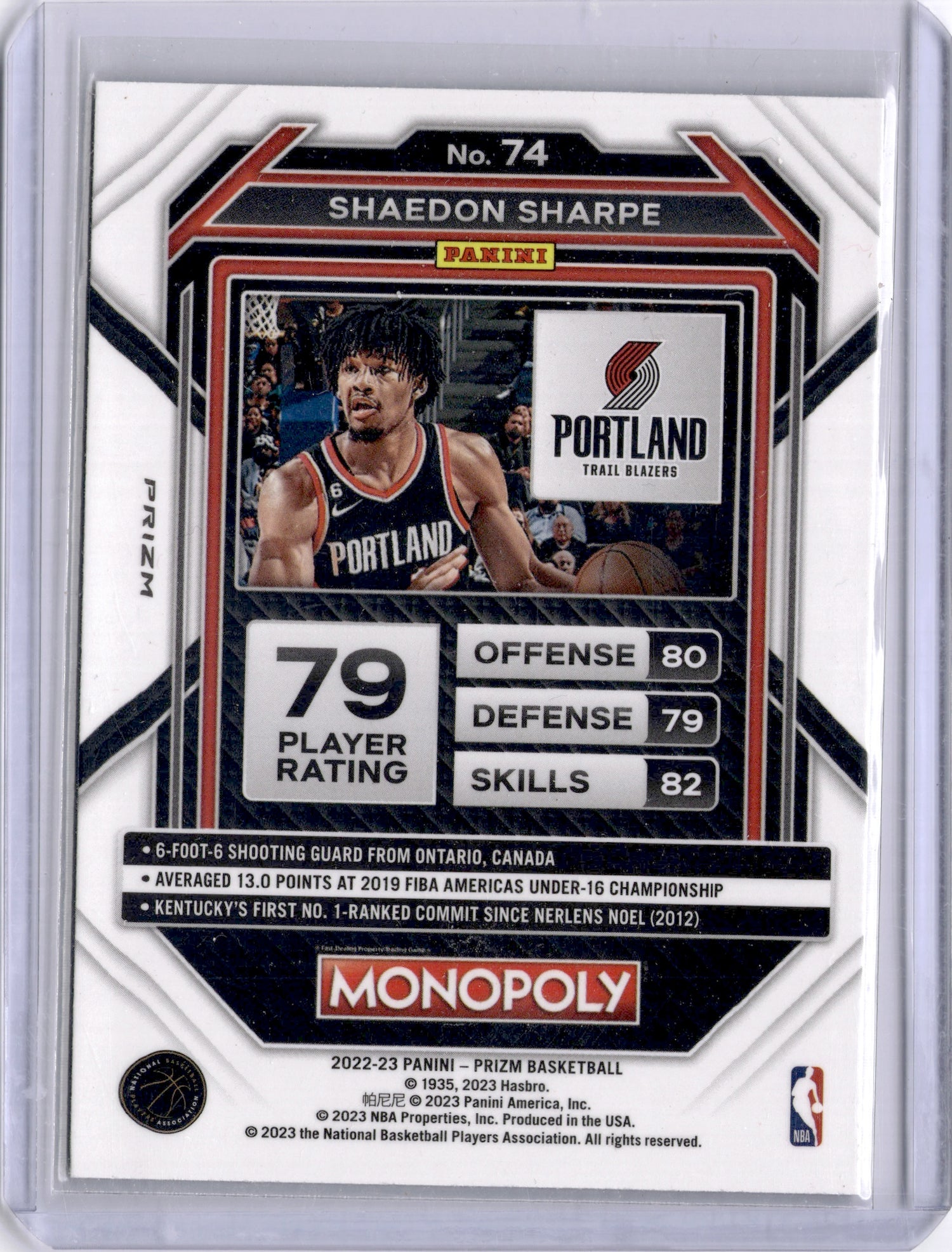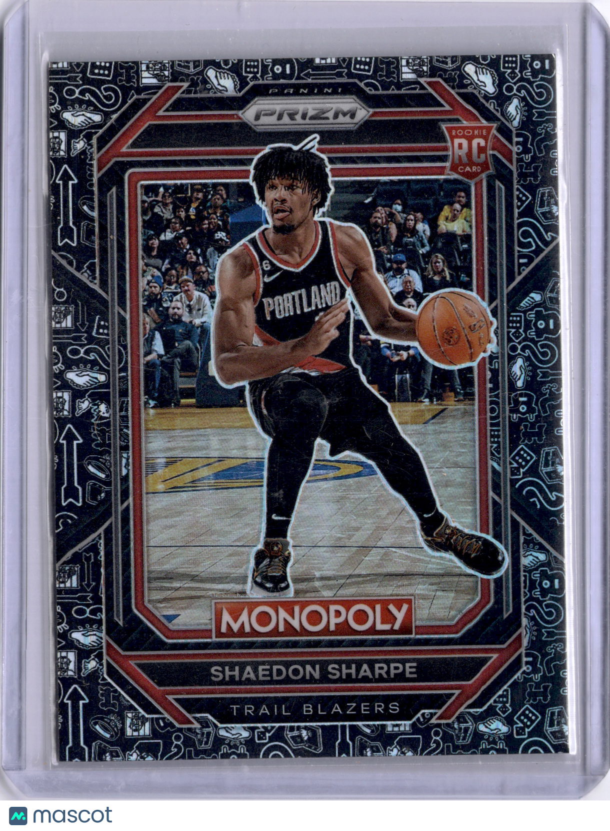 You are purchasing a Shaedon Sharpe 2023 Panini Prizm Monopoly Parallel/Variety Rookie RC Basketball. You will receive the exact item in the photographs. Thank you for looking. Please Read Before Purchasing Card Condition: All cards are sold as raw and listed as used. Cards may display various imperfections including, but not limited to, surface wear, edge and corner flaws, or scratches. These are common in raw cards and do not necessarily impact the visual appeal. Photos Provided: High-quality images are included for every listing. Please review all photos carefully to assess centering, surface, corners, and edges. We encourage buyers to evaluate the condition based on these images. Grading Disclaimer: We are not professional graders and cannot guarantee any specific grade or condition. Requests for grading estimates or guarantees will not be answered. Questions Welcome: If you have any specific questions about the card's condition before purchase, feel free to reach out—we’re happy to help clarify anything we can. Offers & Pricing We appreciate your interest in our listings! Please note: We do not respond to messages asking for our lowest price. If you would like to make an offer, please use the “Make Offer” feature directly on the listing. This ensures fair and timely review of all offers in the order received. Shipping & Returns Cards are shipped securely via USPS Ground Advantage or USPS Proity. All sales are final. We do not accept returns, so please review the photos and item description thoroughly before purchasing or placing a bid. Connect With Us Thank you for checking out our listing! Stay updated on new arrivals and hobby content by following us on Instagram and Twitter: @Lab20Cards Listed With Mascot.